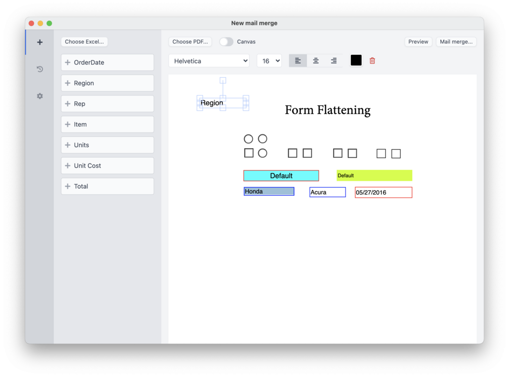 After inputting an Excel file and a PDF file, you can drag and drop the Excel headers into arbitrary positions or match them with native PDF form fields, and then PlainMerge will generate multiple PDFs for you based on rows in the Excel file.